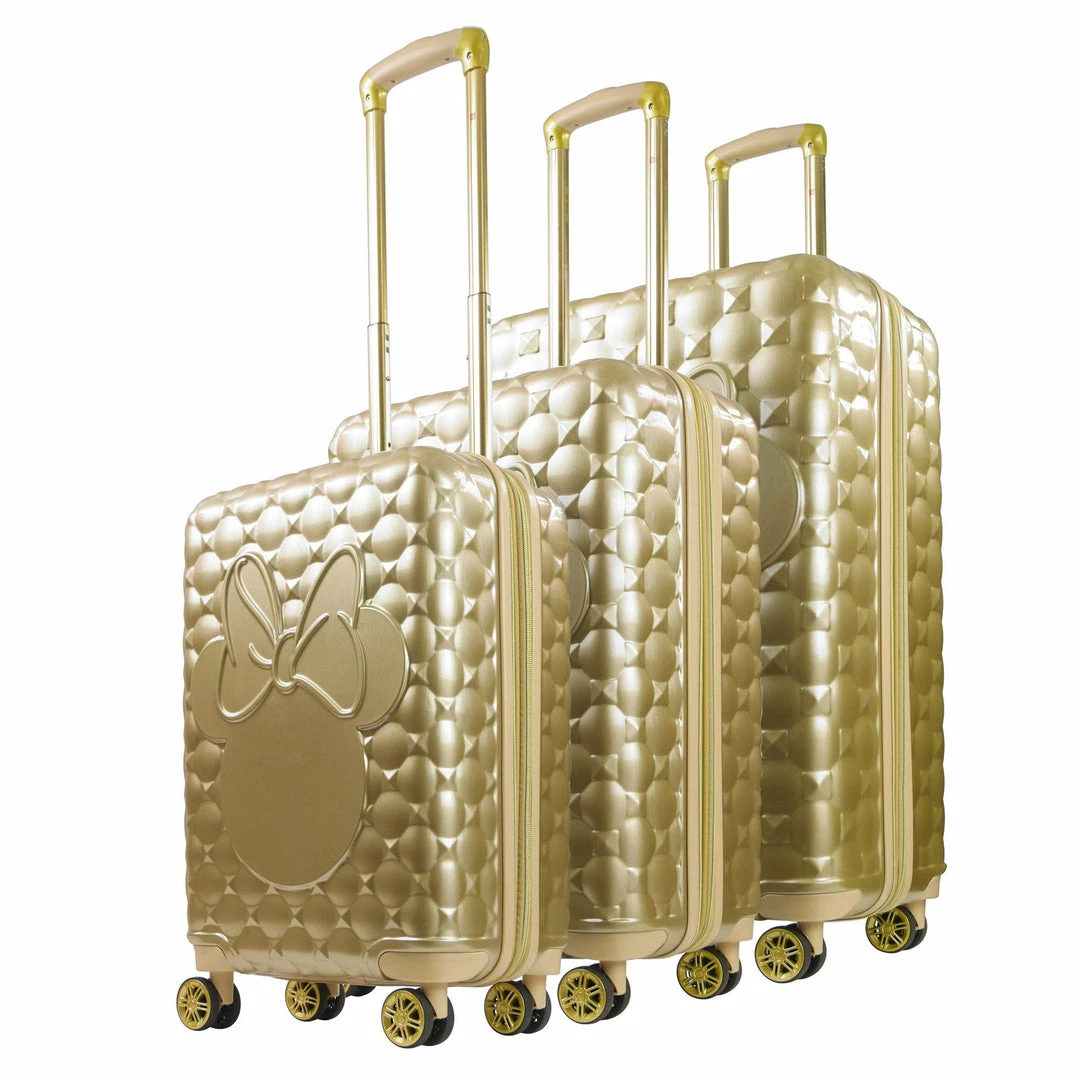 - Officially licensed Disney Minnie Mouse Quilted 3D Molded rolling luggage set.