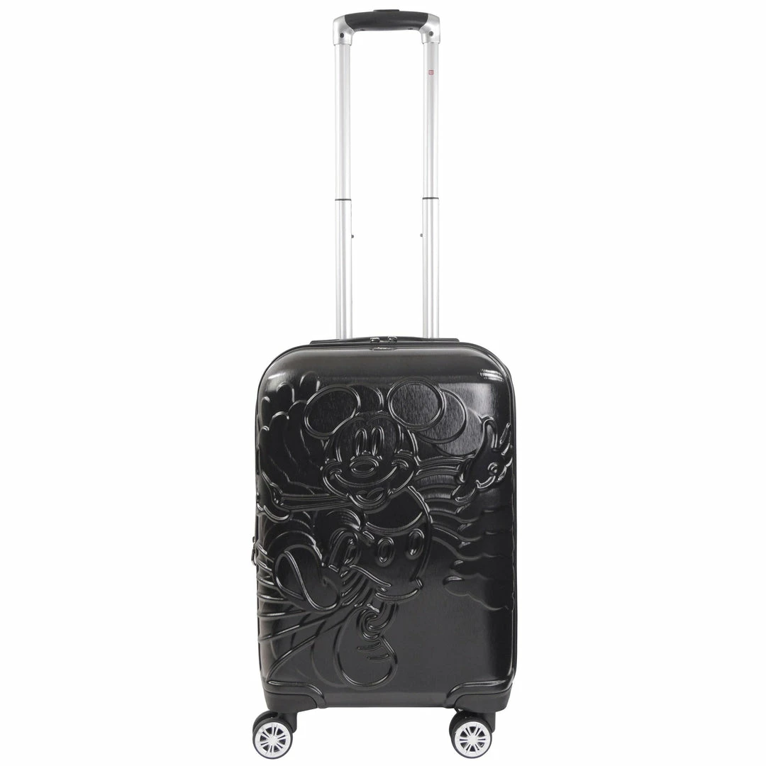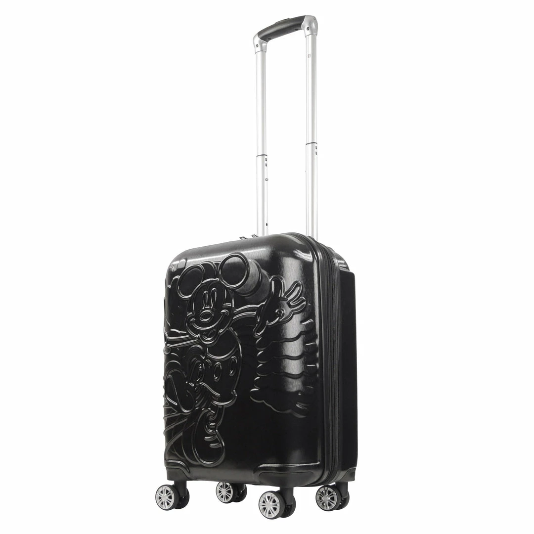 Disney Embossed Running Mickey Mouse is on the front of this 21″ carry-on hard-sided spinner suitcase luggage with a 2″ expandable gusset in classic black that is perfect for your next destination.