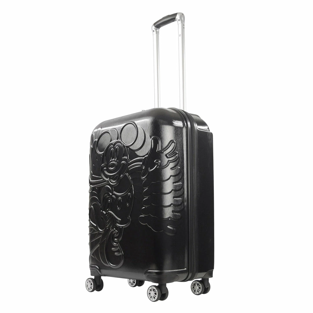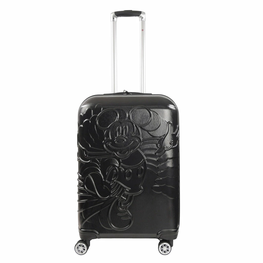 Disney Embossed Running Mickey Mouse is on the front of this 25″ check-in hard-sided spinner suitcase luggage in classic black that is perfect for your next destination.