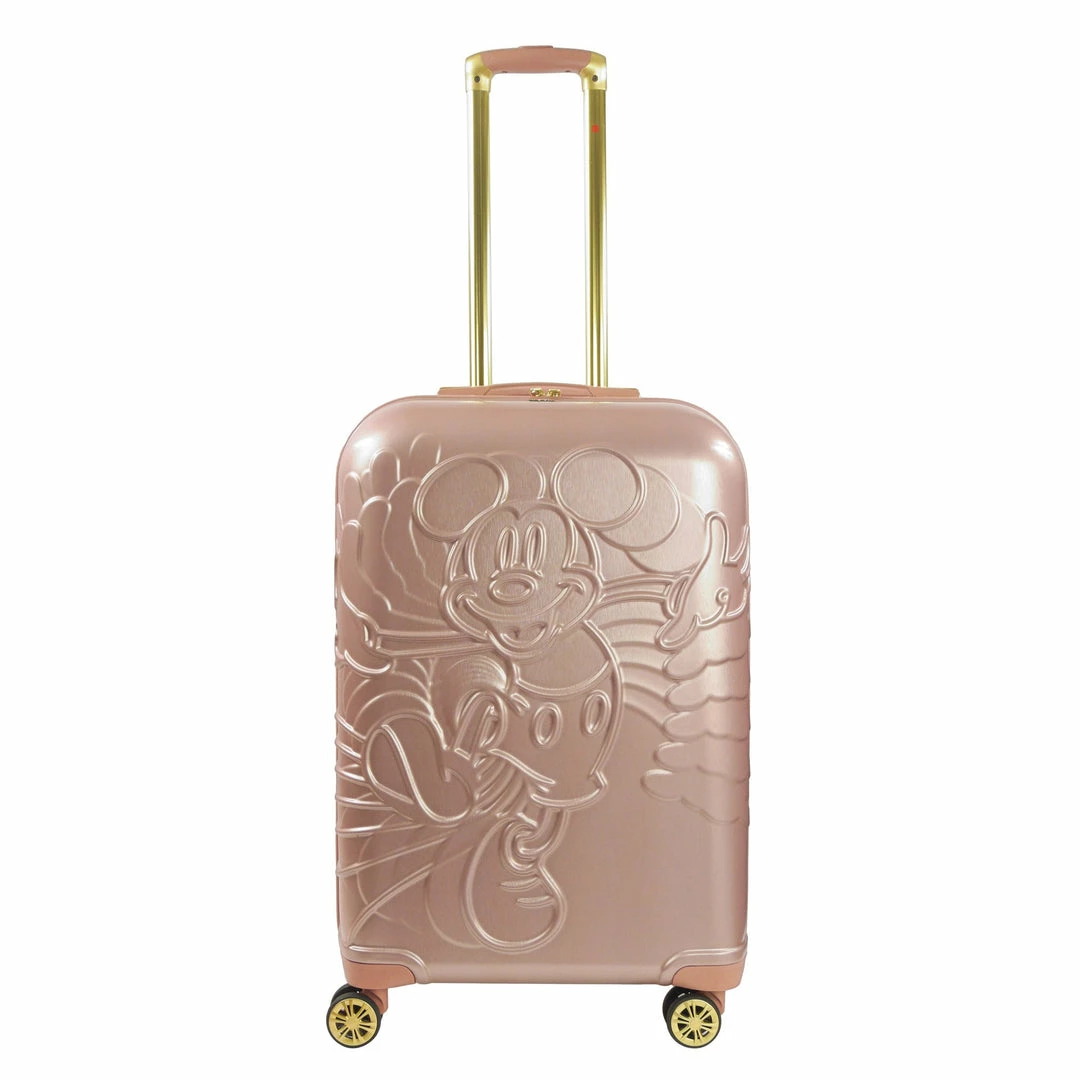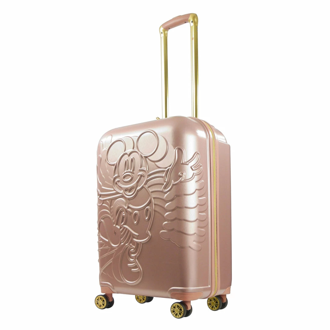 Disney Embossed Running Mickey Mouse is on the front of this 25″ check-in hard-sided spinner suitcase luggage in stunning rose gold that is perfect for your next destination.