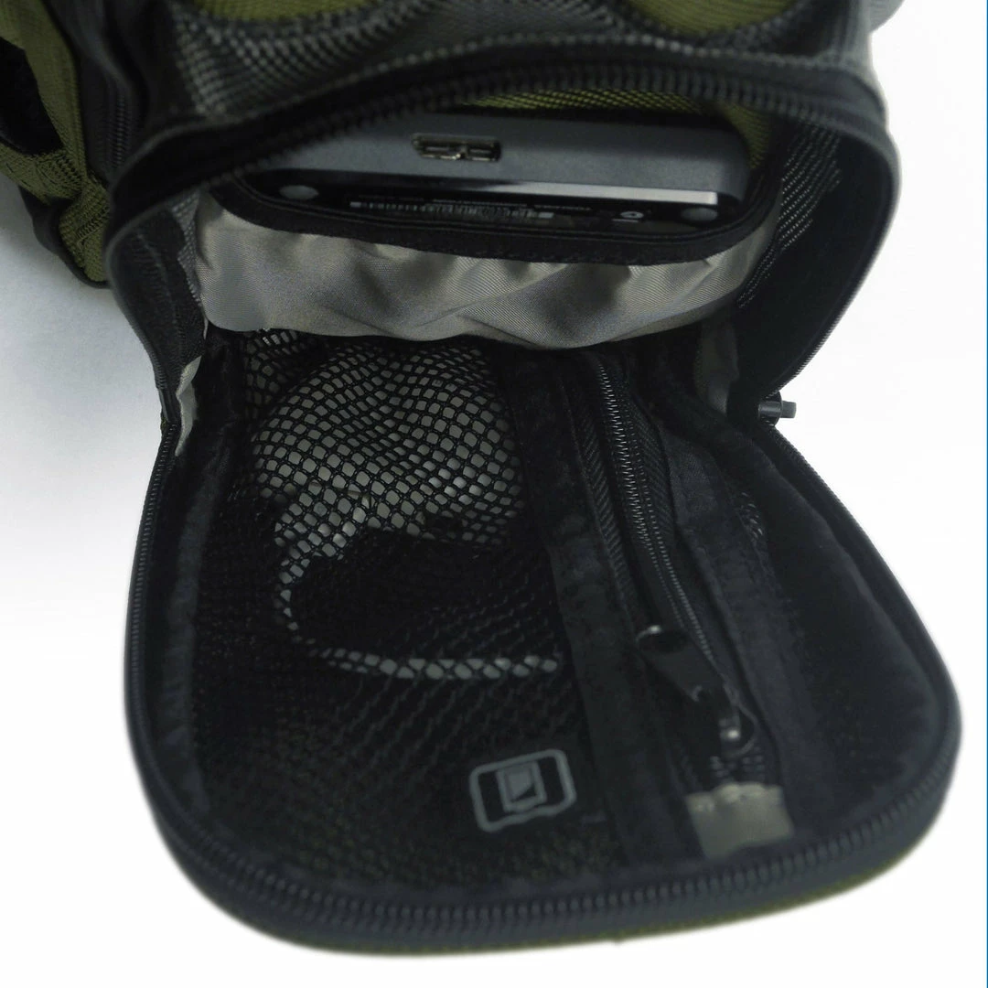 - The left side has a slip pocket for your phone with a pass-through to an additional slip pocket for storing a power bank (sold separately).