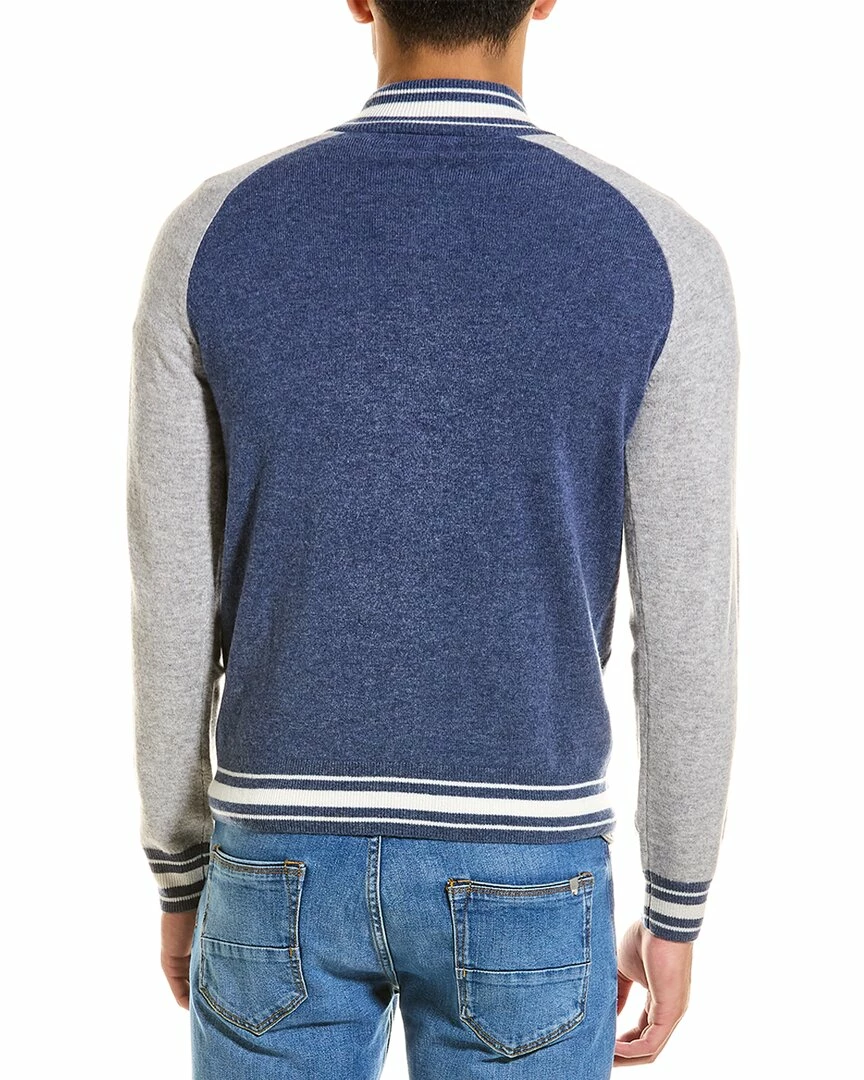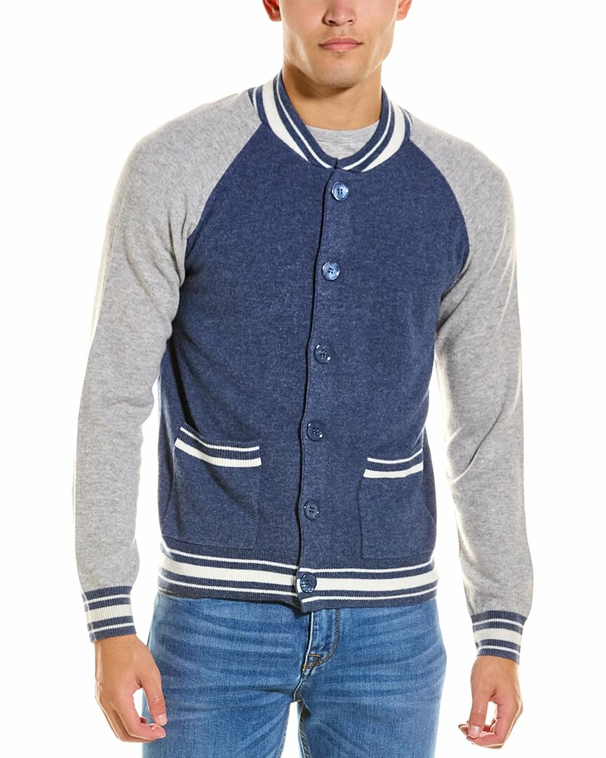 - Button Wool & Cashmere-Blend Cardigan In Blue Multicolor With Colorblocked Design, Raglan Sleeves, Dual Front Pockets And Ribbed Trim