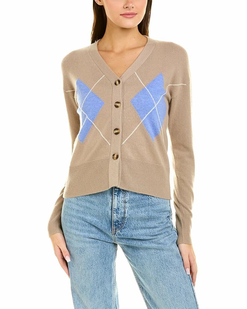 - Argyle Cashmere Cardigan In Tan And Blue With Dropped-Shoulder Sleeves And Ribbed Trim