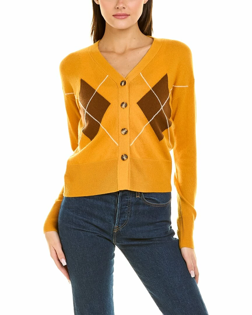 - Argyle Cashmere Cardigan In Orange With Dropped-Shoulder Sleeves And Ribbed Trim