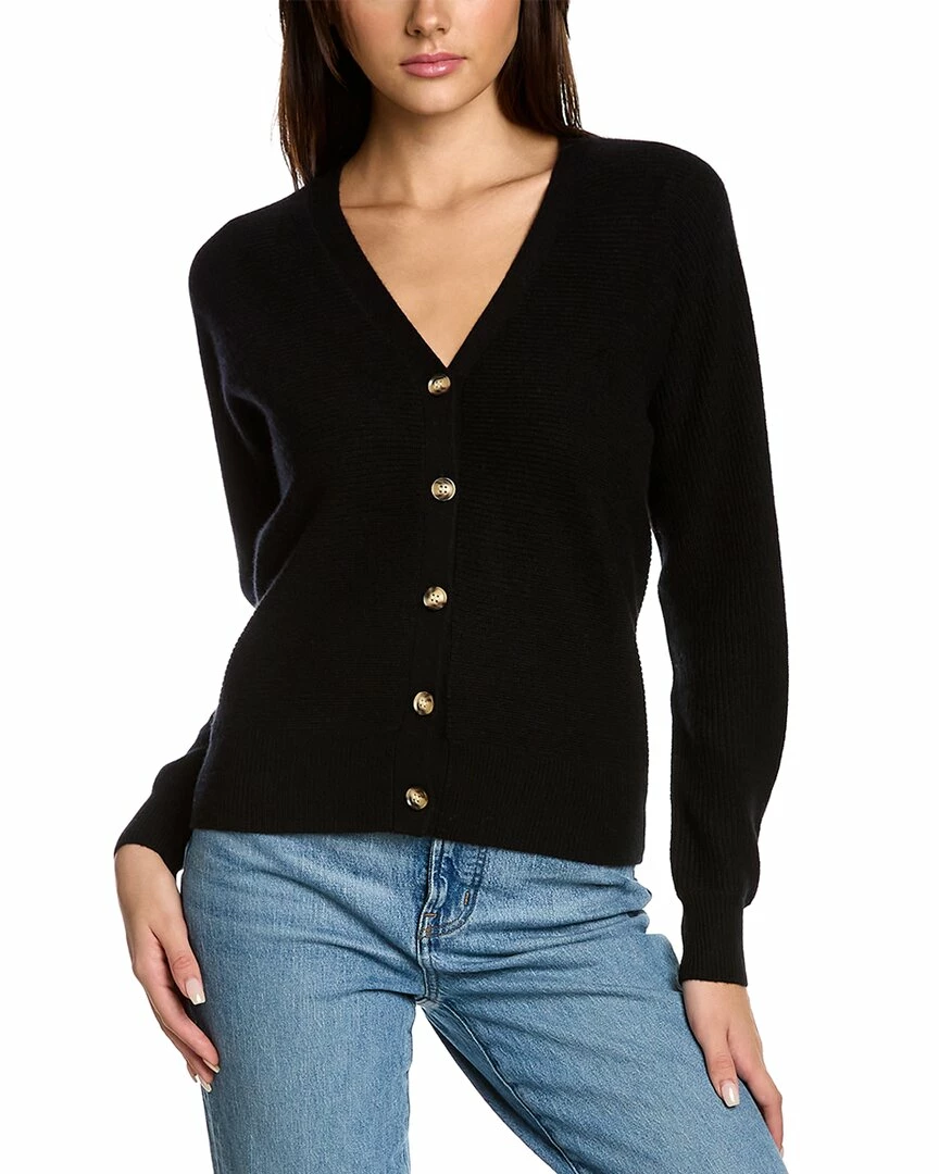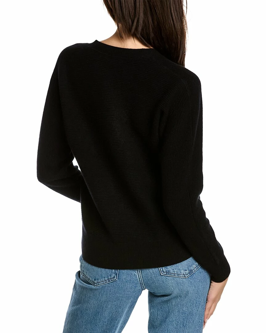 - Fancy Stitch Cashmere Sweater In Black With Ribbed Knit And V-Neck