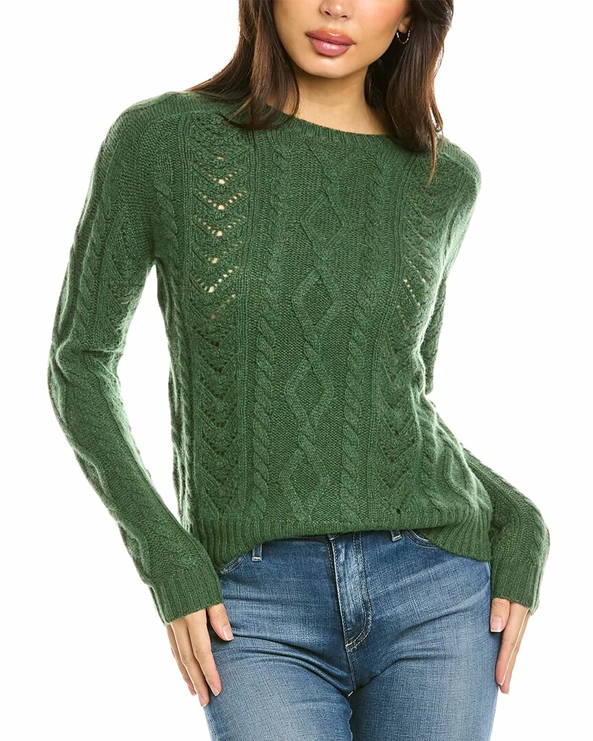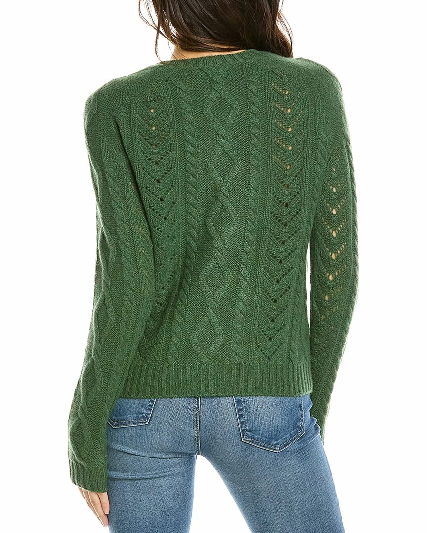 - Multi-Knit Cashmere Sweater In Olive Green With Saddle Shoulders, Pointelle And Cable Knit Detailing, And Ribbed Trim
