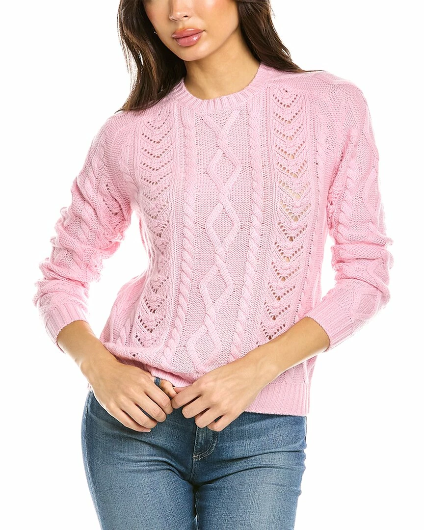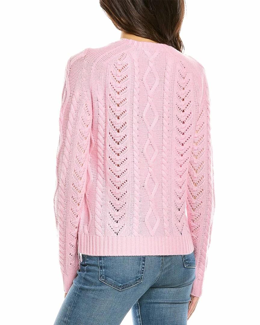 - Multi-Knit Cashmere Sweater In Pink With Saddle Shoulders, Pointelle And Cable Knit Detailing, And Ribbed Trim