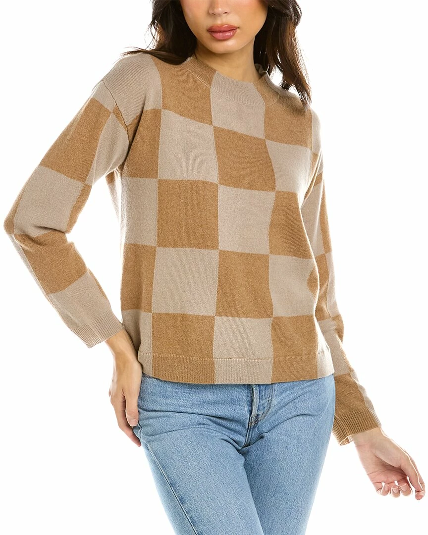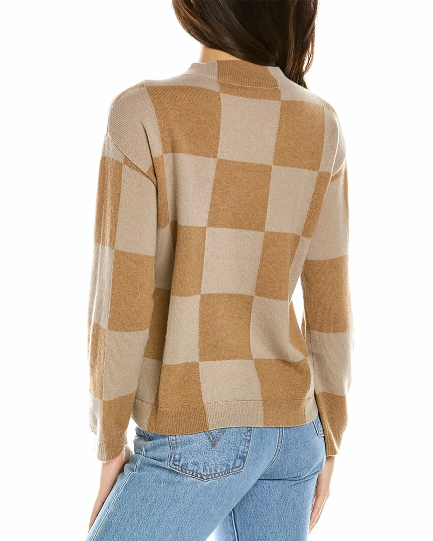 - Square Print Cashmere Sweater In Tan/Brown With Dropped-Shoulder Sleeves