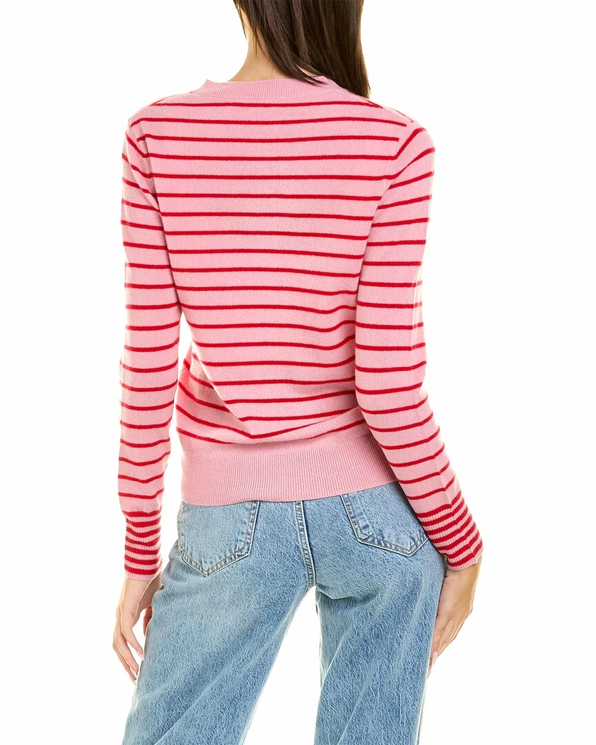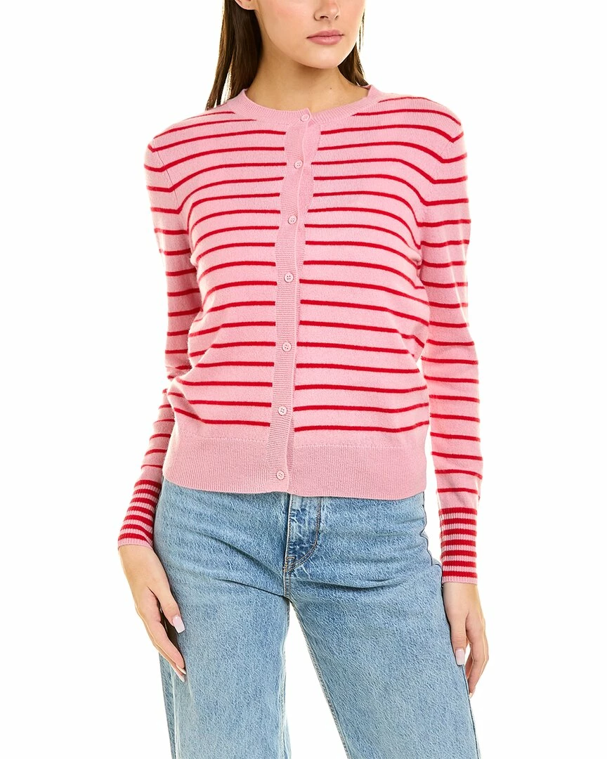 - Striped Cashmere Cardigan In Pink With Ribbed Trim
